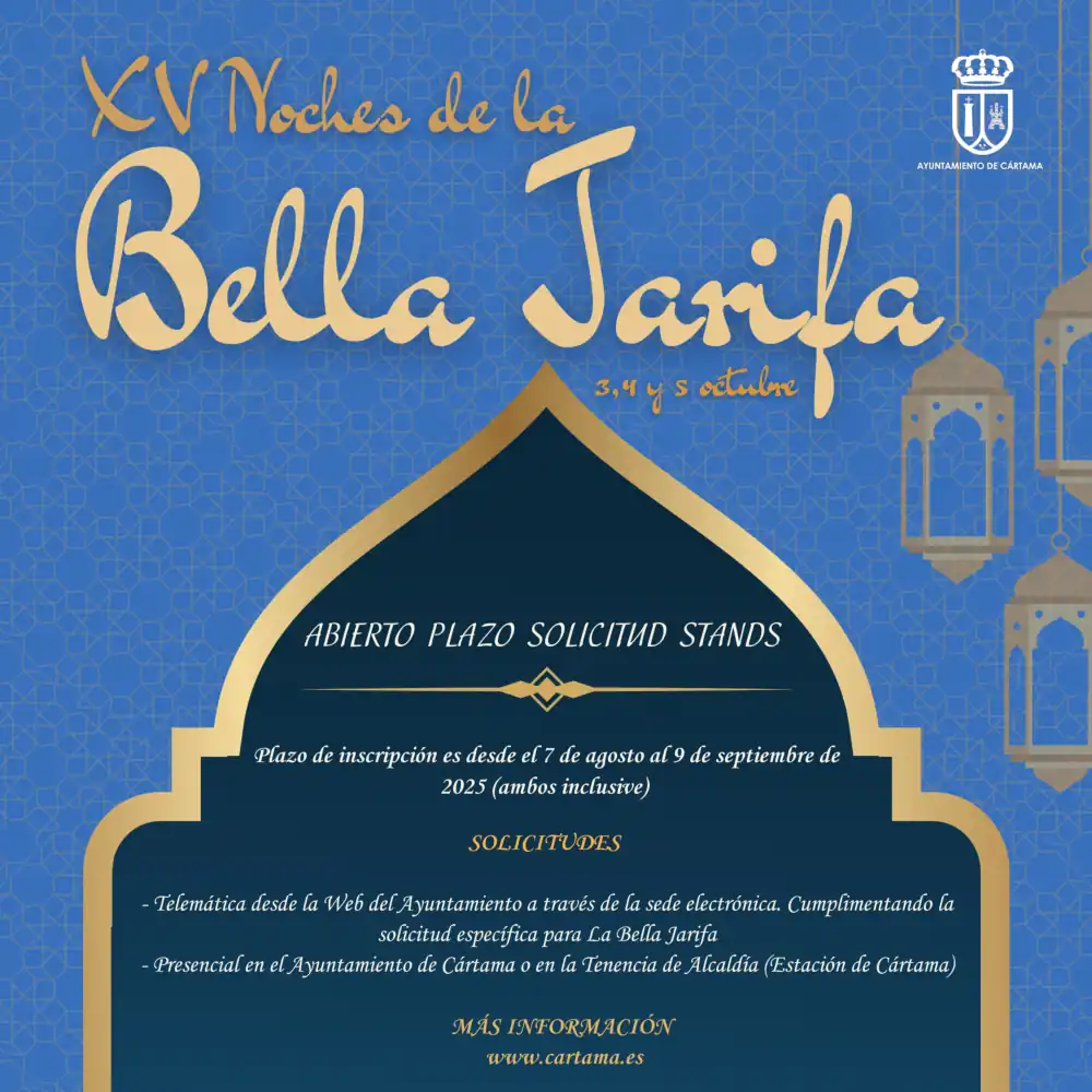 El Área de Feria y Fiestas del Ayuntamiento de Cártama iniciará el próximo 7 de agosto el plazo de presentación de solicitudes para optar a un puesto en la XV edición de las Noches de la Bella Jarifa, evento que se celebrará del 3 al 5 de octubre en el casco histórico del municipio.