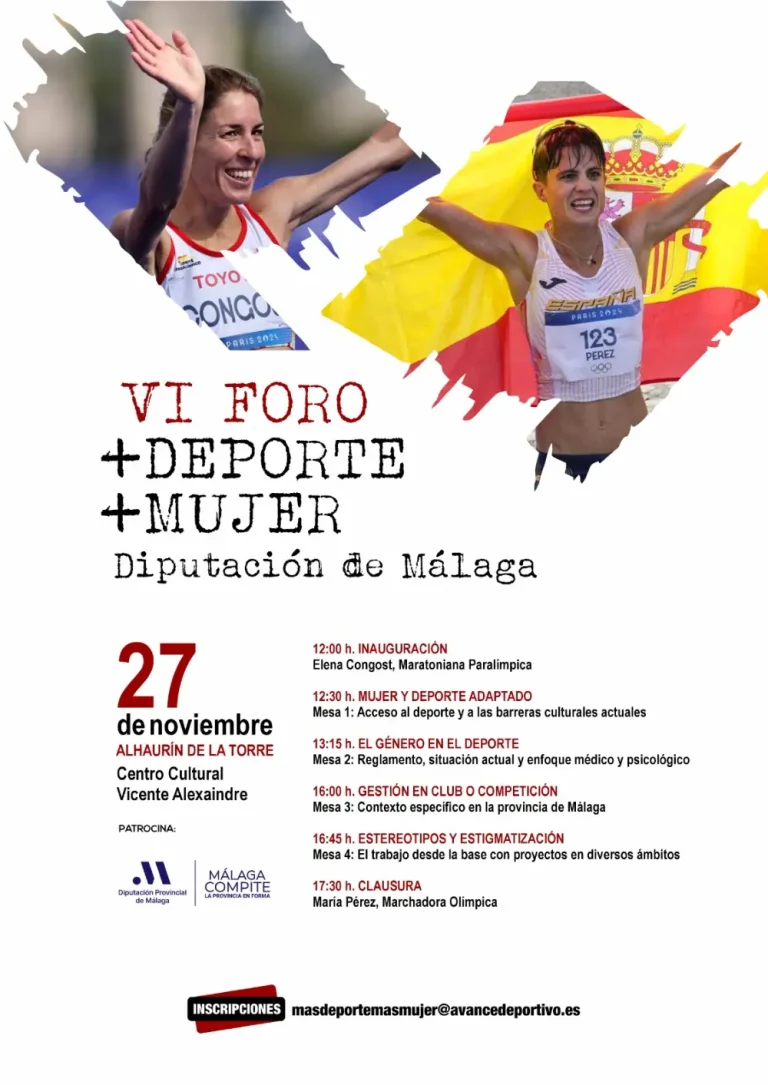 Una completa jornada formativa y reivindicativa que pretende situar al VI Foro Más Deporte Más Mujer Diputación Provincial de Málaga como referente en materia de debate, propuestas y divulgación para seguir situando a la provincia de Málaga como epicentro en la lucha por la equidad en el deporte. Por primera vez, el programa se desarrollará fuera de la capital parando en Alhaurín de la Torre. El objetivo es precisamente dotarlo de un carácter itinerante por toda la provincia en las próximas ediciones. Los encargados de presentar el evento y de moderar las mesas redondas serán los periodistas Cristina Mena y Nacho Gutiérrez. Las inscripciones siguen abiertas a través del mail masdeportemasmujer@avancedeportivo.es, aunque la asistencia será libre a cualquiera de las mesas siempre que haya aforo disponible.